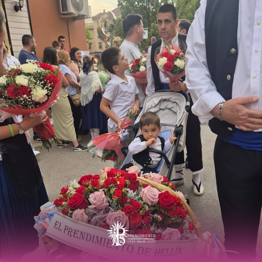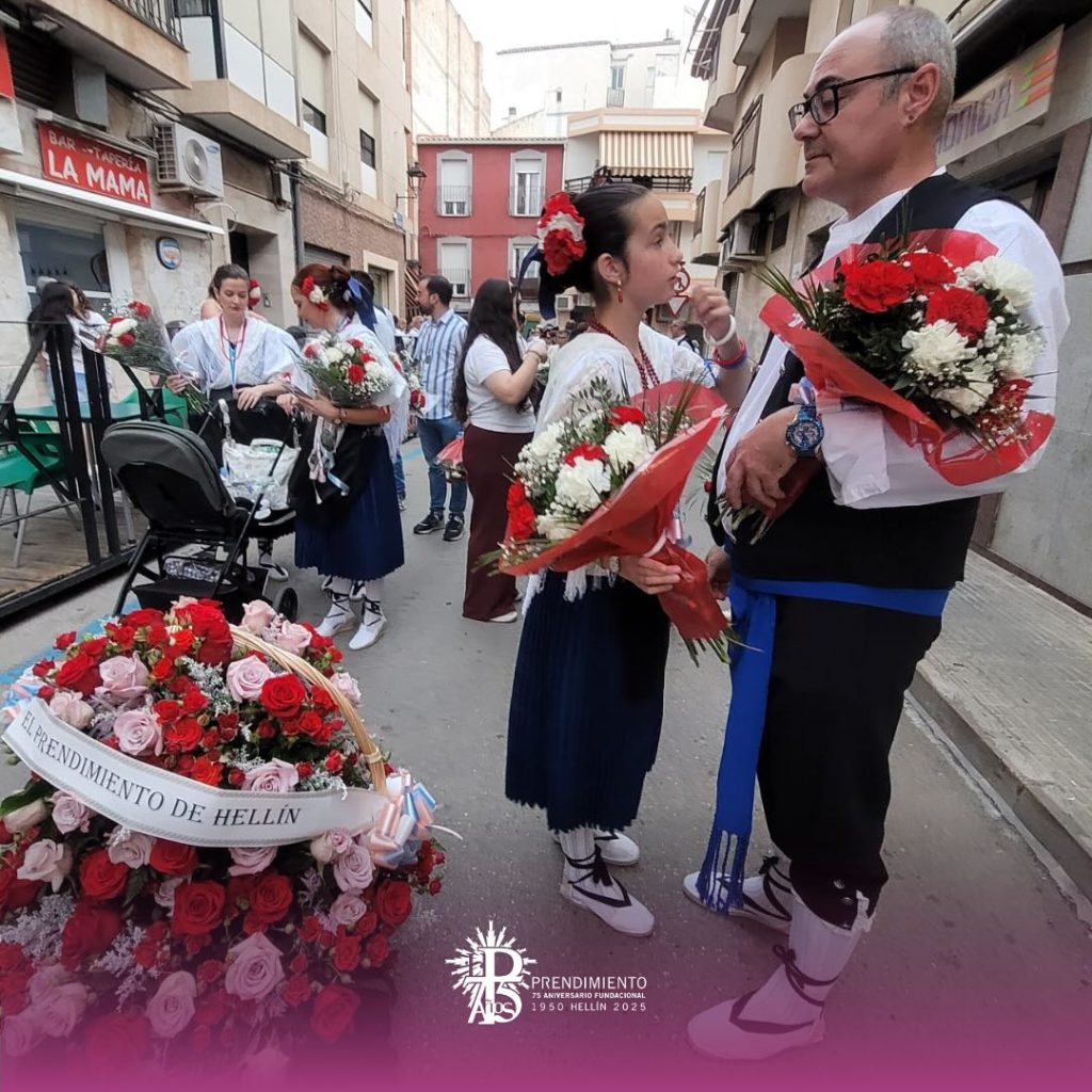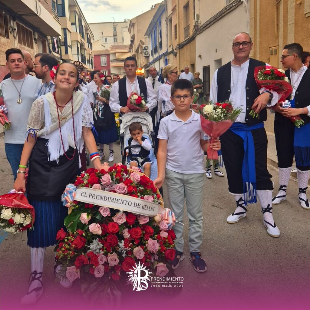 Familias, padres, hijos, nietos y abuelos han representado al Prendimiento en el cortejo, vistiendo el traje típico de hellinero y hellinera. La comitiva ha partido desde la Plaza de Santa Ana y ha culminado su recorrido en la escalinata de la Parroquia de la Asunción, a los pies de la Virgen, donde se han depositado las flores como muestra de devoción y gratitud.