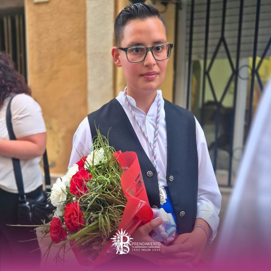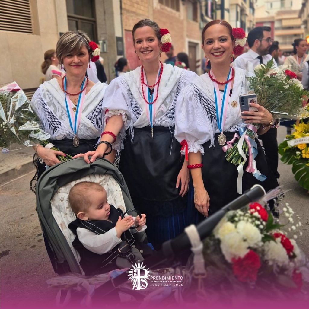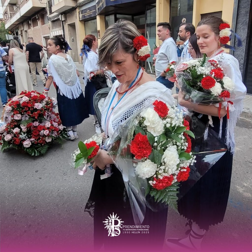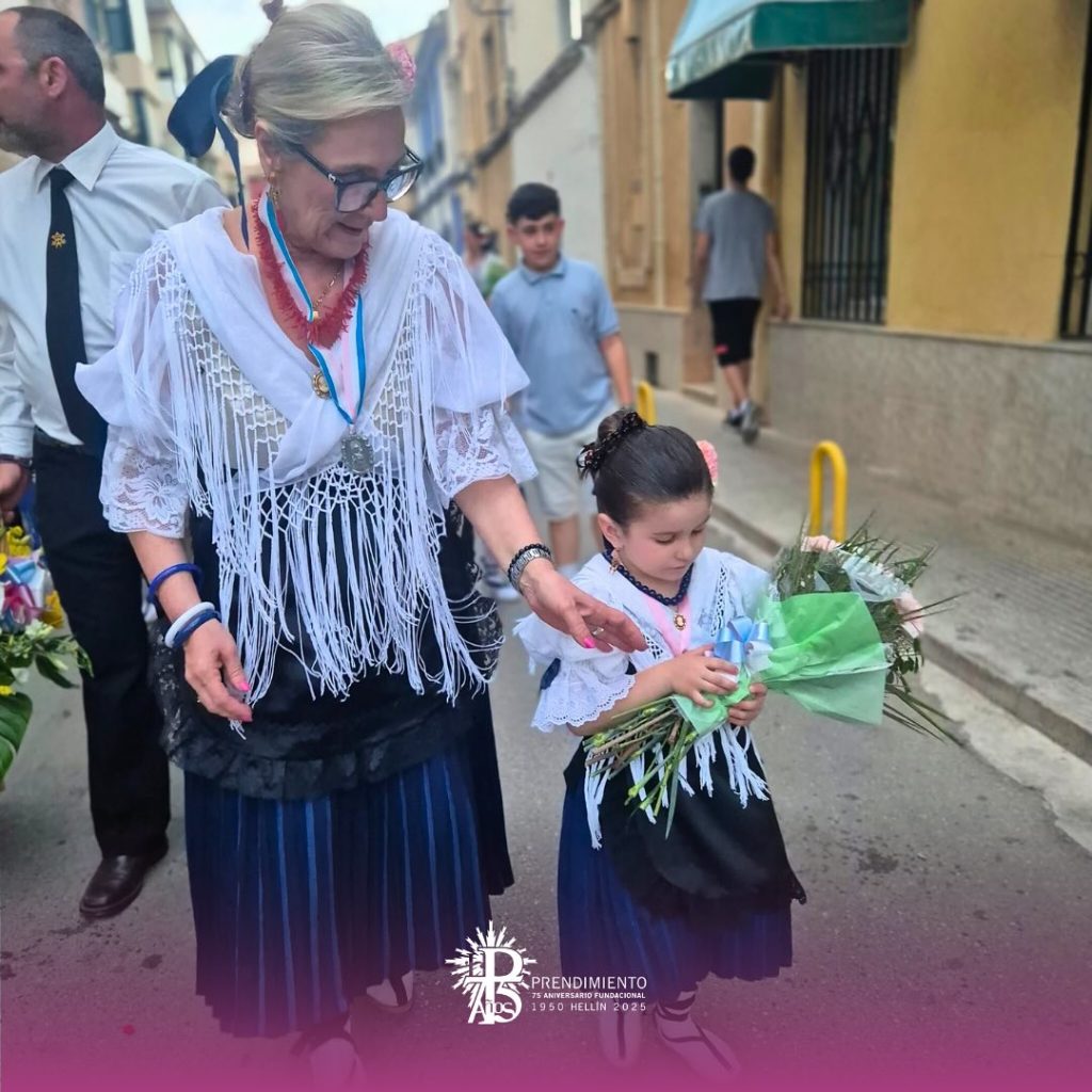 Familias, padres, hijos, nietos y abuelos han representado al Prendimiento en el cortejo, vistiendo el traje típico de hellinero y hellinera. La comitiva ha partido desde la Plaza de Santa Ana y ha culminado su recorrido en la escalinata de la Parroquia de la Asunción, a los pies de la Virgen, donde se han depositado las flores como muestra de devoción y gratitud.